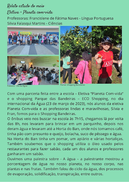 Nossa escola teve a oportunidade de conhecer um pouquinho deste ambiente e esperamos que ajude na conscientização que devemos cuidar da vida em nosso planeta e, respeitar todos os ambientes que ele nos proporciona, para o equilíbrio do mundo em que vivemos.